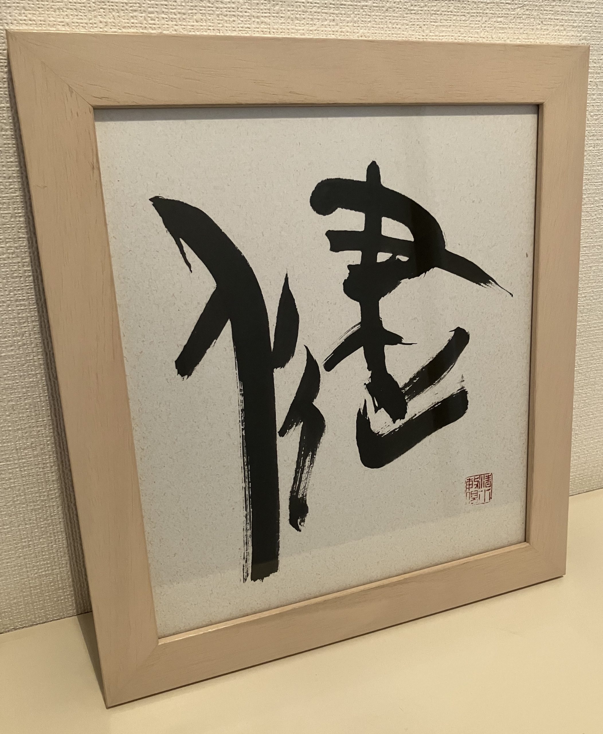 写真は、書作家の 故清水研石先生 からいただいたの書「健」と、16周年の折にいただいた洋蘭です。